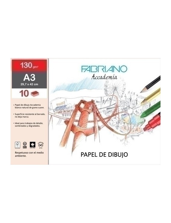 Sobre con 10 hojas de papel blanco de grano natural de 130 gramos, libre de ácidos, tamaño de 297 x 420 mm y certificado FSC®. Ideal para carboncillo, ceras, lápiz, pastel, rotulador y sanguina.