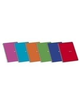 Cubierta extra dura de cartón forrado con papel impreso a color y plastificado. Espiral sencillo con lazo vuelto, lacado negro. Interior en papel offset blanco extra de 70 g/m con margen. Rayados con CUADROVÍA en varios tamaños. 80 hojas. Disponibles en folio y cuarto y distintos colores.