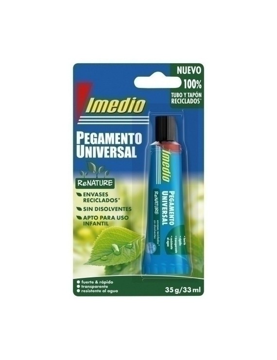 Pegamento Universal sin disolventes, adhesivo universal líquido, innovador y de alto rendimiento con adherencia inicial muy elevada. Pegado tan sólido como la versión clásica. Ideal para la oficina, escuela, guardería y hogar. Secado rápido e inodoro. Lavable en condición mojada. Pega materiales variados, incluso poliestireno y PVC. Una vez aplicado, el pegamento es ajustable durante unos minutos. Apto para pegar: cartón, papel, fieltro, cuero, corcho, tejidos, madera, entre ellos y a metal, porcelana, vidrio, poliestireno expandido y numerosos materiales plásticos. No apropiado para fotos, polietileno (PE) y polipropileno (PP).