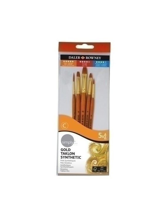 Set de cinco pinceles de pelo sintético "taklon" dorado, para pinturas acrílicas redondo nº3, lengua de gato nº4, plano (nº 6 y 10) y liner nº2. Ideal para principiantes y aficionados.