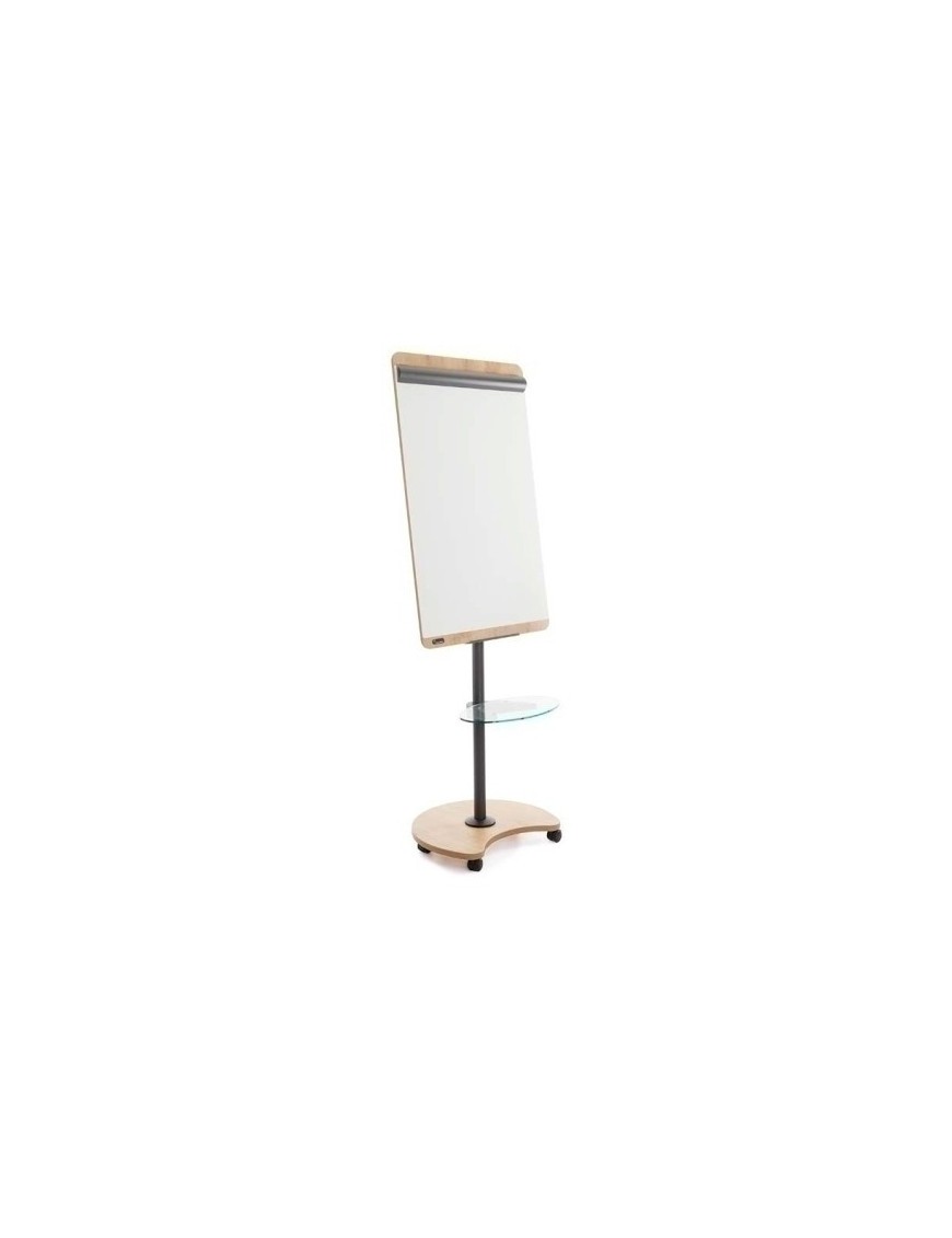 Pizarra de conferencia móvil, con soporte móvil de melamina en color roble, superficie de escritura magnética, brazos abatibles superiores de sujeción para blocs de pizarra (retirar embellecedores), y base de melamina de 5 ruedas. Un diseño elegante para rotuladores de borrado en seco. Fácil montaje. Medida total: 2000 x 690 x 620 mm. Superficie de escritura: 970 x 680 mm.