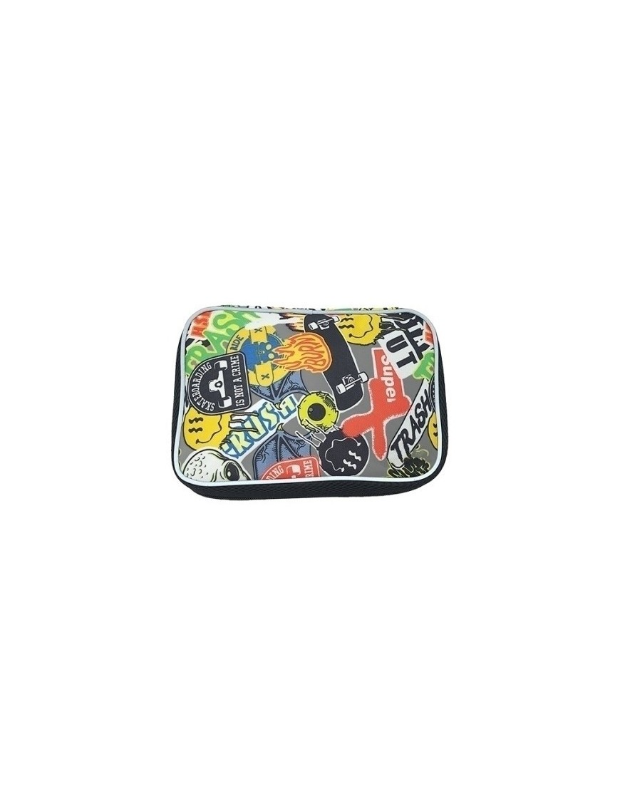 Cartuchera Trend forrado interiormente, con bolsillo de red interno en tapa, solapa interior con 24 elásticos, compartimento amplio y profundo para útiles. Material: twill estampado. Medidas: 165 x 235 x 55 mm.
