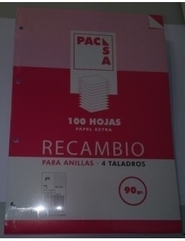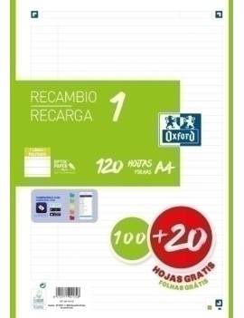 Recambio de 4 taladros con 80 hojas de papel extra blanco de 100 gramos, con cuadrícula de 5x5 y bandas de colores del mismo color que la portada, para que llevar varias asignaturas en un mismo carpebloc sea más fácil.