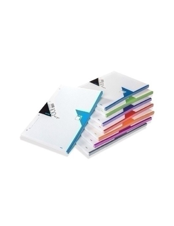 Papel blanco Extra de 90 gr/m² con impresión Offset, encolado lateral, cuatro taladros y rayado con banda del mismo color. Se presenta en paquete retractilado con carátula de cartón de 225 gr/m² impreso a dos colores.