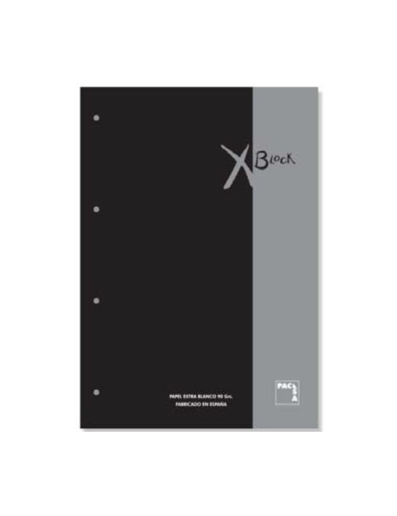 Recambio de 4 taladros con 80 hojas de papel extra blanco de 90 gramos, con banda del mismo color que la portada y cuadrícula de 5x5 + greca en color azul. Un recambio con portada y contraportada de cartón de 225 g/m², plastificado y encolado.