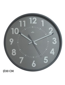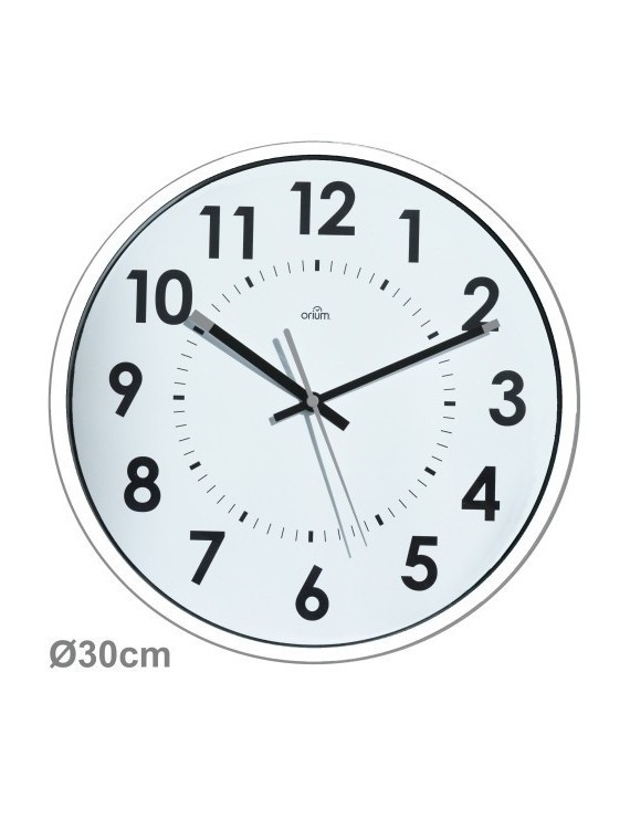 Reloj de pared con esfera en color blanco, números en negro, aguja segundera del color del marco, aguja minutera con detalle del color del marco y vidrio de protección mineral. Un complemento de oficina con marco ABS de alto impacto que funciona con pila LR6 (incluida).