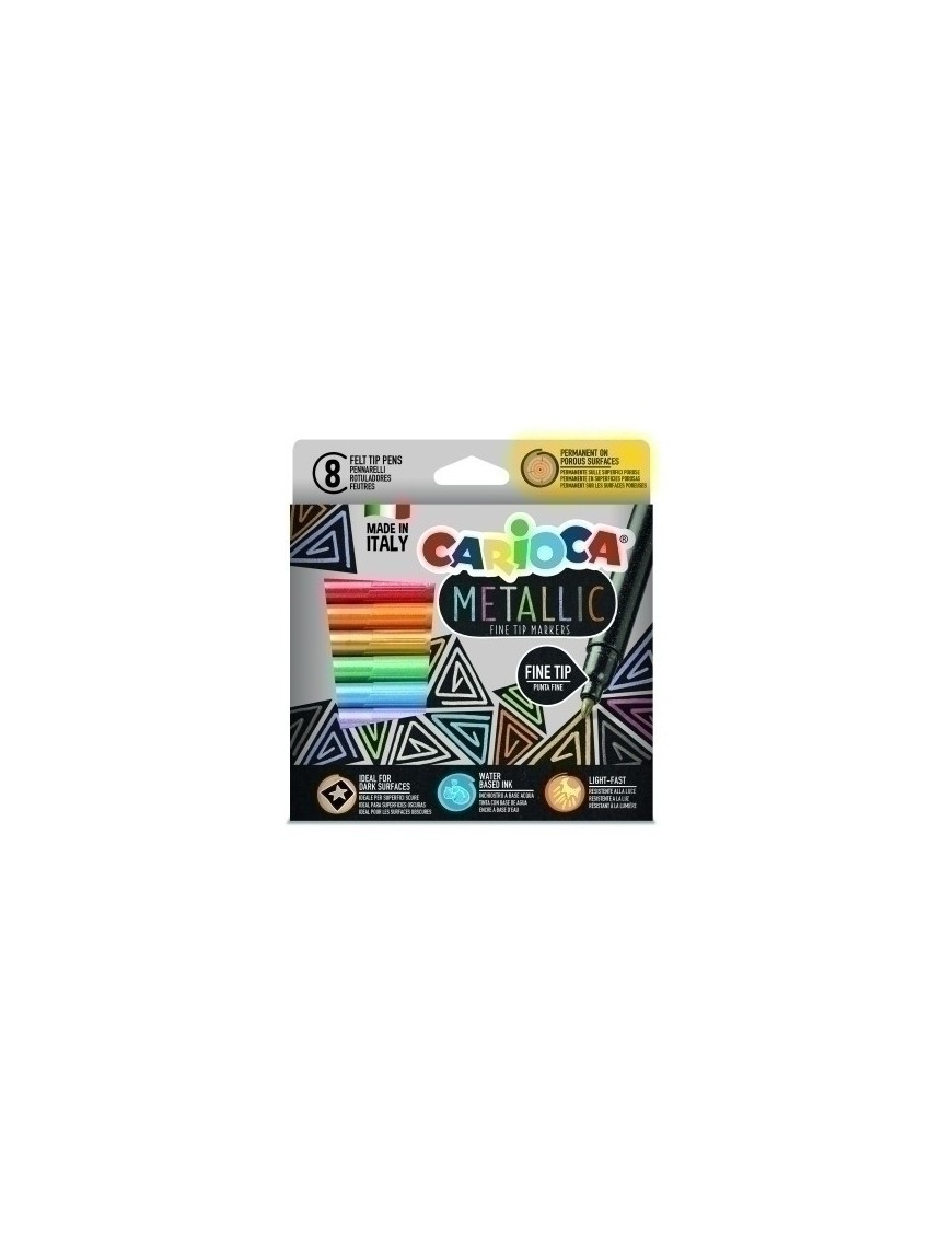 8 rotuladores metálicos de punta fina; con cuerpo fabricado con un 56 % en plástico reciclado; tinta a base de agua y punta bloqueada. Colores permanentes en superficies porosas y removibles en superficies lisas. Ideal para superficies oscuras; para un efecto más duradero, fijar con un spray acrílico.