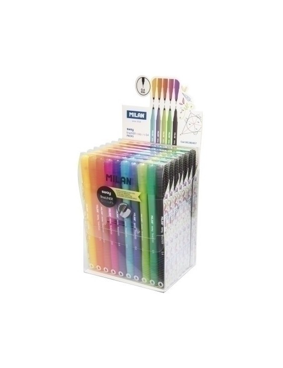 7 estuches flexibles con 10 rotuladores de punta fina de fibra SWAY de 0,4 mm, con soporte metálico. Un diseño SWAY con cuerpo redondo ergonómica del mismo color que la tinta (base agua) y tapa acoplable a la parte final del rotulador. El estuche permite doblar la tapa y disponer los bolígrafos en un cómodo expositor de sobremesa.