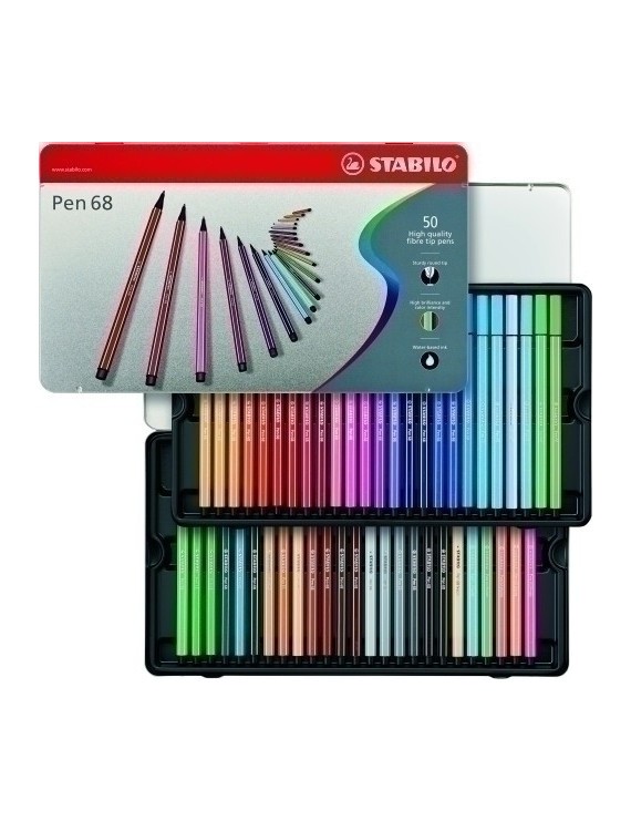 Estuche de metal con colores surtidos de rotuladores STABILO 68: punta de fibra, colores intensos, pigmentos seleccionados, punta media de trazo 1 mm y sus significativas rayas blancas. Perfectos para un gran abanico de público, desde principiantes a profesionales.
