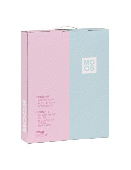 Contiene 29 piezas : goma, lápiz de grafito, bolígrafo azul-rojo, y sacapuntas (1er compartimento) 10 colorines de madera, y 14 rotuladores de colores (2º compartimento).