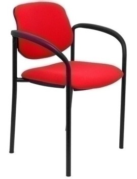 Silla confidente de 4 patas con brazos incorporados en la estructura. Respaldo ergonómico con exterior de PVC de 2 mm de grosor, espuma de 50 mm de grosor y 20 kg/m³ de densidad. Asiento ergonómico con espuma de 50 mm de grosor y 25 kg/m³ de densidad. Ambos tapizados en tejido ARAN de color. Brazos fijos; y estructura de tubo oval de 30x15 mm en pintura epoxi negra. Una silla apilable hasta en 3 alturas para un uso intensivo de 8 horas.