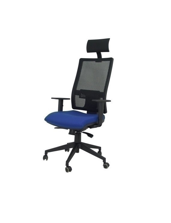 Silla de oficina ergonómica con mecanismo sincro, regulable en altura con: respaldo alto de malla transpirable con cabecero negro; asiento con interior de PVC, refuerzo panal y espuma inyectada de 50 kg/m3 tapizado en tejido BALI en color; base piramidal de fibra de vidrio de 5 radios y 70 cm de diámetro, en color negro y ruedas de parqué. Medidas: 1360 x 680 x 570 mm. Medidas del asiento: 570 x 510 x 450 mm.