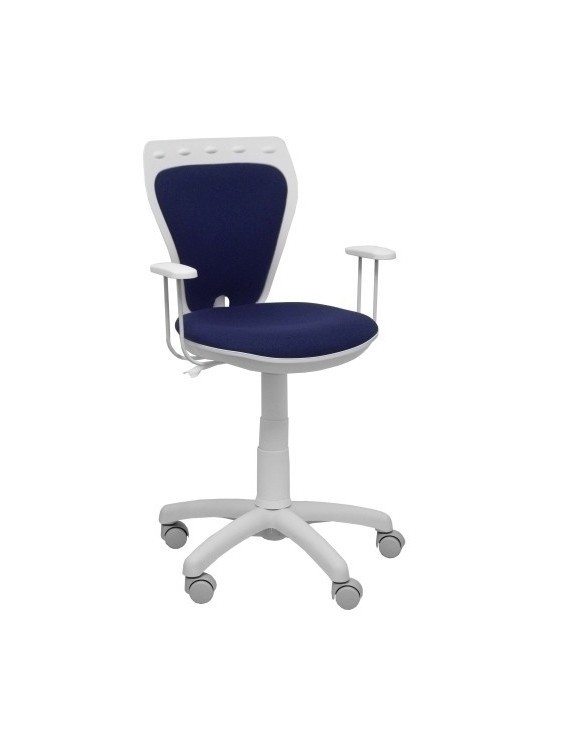 Silla juvenil con brazos, ergonómica con mecanismo de contacto lama y regulable en altura. Brazos fijos en color blanco. Carcasas exteriores en PVC en color blanco. Asiento ergonómico con espuma de 4 cm de grosor y densidad 25 kg/m³. Respaldo y asiento tapizados en tejido BALI de color. Mecanismo de contacto lama. Regulable en altura mediante cilindro de gas. Giratoria 360º. Telescópico color blanco. Base poliamida de alta resistencia de 5 radios y 50 cm de diámetro, en color blanco y ruedas autofrenantes de nylon color gris. Una silla de fácil montaje para un uso moderado de 4 a 6 horas.