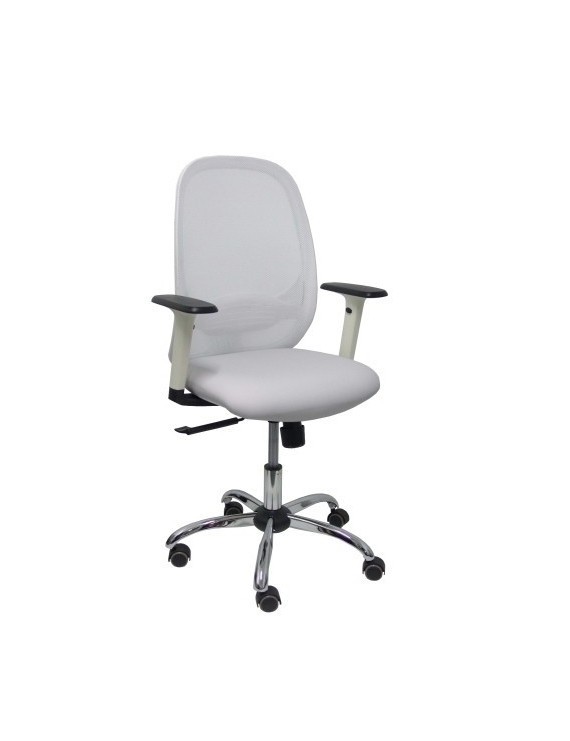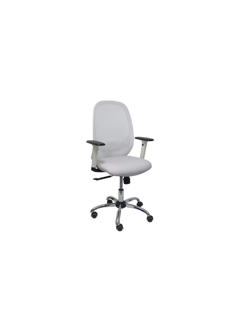 Silla de oficina ergonómica con mecanismo sincro, brazos regulables y ajustable en altura. Incluye refuerzo lumbar regulable. Respaldo de malla transpirable de color con marco de color. Asiento con interior de PVC con refuerzo panal, exterior de PVC de 20 mm de grosor, de color blanco y tapizado en tejido SIMILPIEL de color. Brazos regulables en altura de color blanco. Mecanismo sincro, que permite la regulación del respaldo y el asiento. Refuerzo lumbar regulable. Regulable en altura mediante cilindro de gas cromado. Giratoria 360º. Base metálica con acabado cromado de 5 radios y 60 cm de diámetro; y ruedas con rodamientos de goma especial para suelos delicados. Una silla de fácil montaje para un uso intensivo de 8 horas.