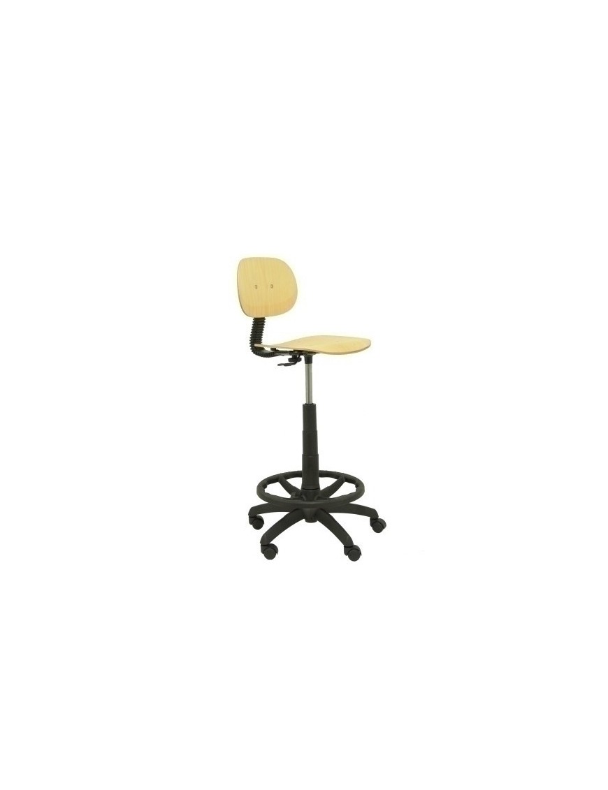 Taburete de trabajo ergonómico, giratorio y regulable en altura, con asiento y respaldo de madera. Respaldo y asiento ergonómicos de madera lacada natural de 2 cm de grosor, en color haya. Mecanismo de contacto lama. Regulable en altura mediante cilindro de gas de 20 cm (siendo la altura más baja del asiento de 85 cm y la altura en la posición más alta de 105 cm). Giratorio 360º. Telescópico en color negro. Aro reposapiés cromado de alta resistencia y 20 cm de diámetro. Base de poliamida alta resistencia de 5 radios y 60 cm de diámetro; y ruedas de nailon. Un taburete de fácil montaje para un uso extremo de 24 horas.