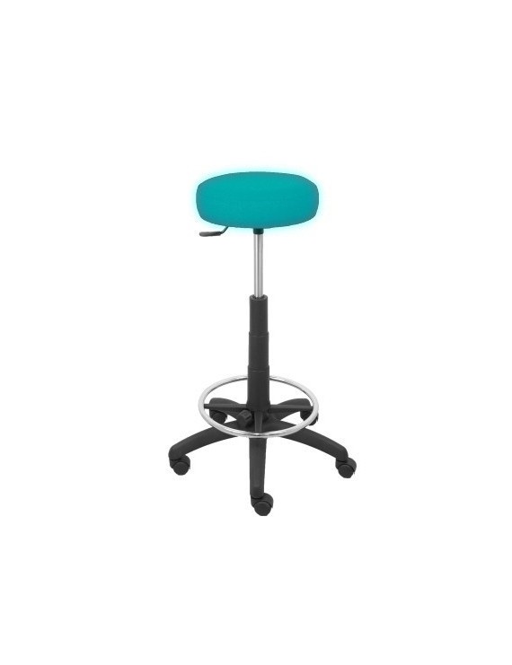 Taburete de trabajo giratorio con altura regulable mediante cilindro de gas. Asiento tapizado en tejido BALI de color, hecho con tablero aglomerado de 16 mm de grosor y acolchado de espuma de 8 cm de grosor y 30 Kg/m³. Regulable en altura mediante cilindro de elevación a gas. Giratoria 360º. Base de nylon de 5 radios y 60 cm de diámetro, en color negro. Ruedas de nailon con rodamiento de goma y eje central de acero; y aro reposapiés cromado de 40 cm de diámetro. Un taburete para un uso moderado de 4 a 6 horas para oficina, taller y hogar.