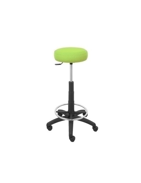 Taburete de trabajo giratorio con altura regulable mediante cilindro de gas. Asiento tapizado en tejido BALI de color, hecho con tablero aglomerado de 16 mm de grosor y acolchado de espuma de 8 cm de grosor y 30 Kg/m³. Regulable en altura mediante cilindro de elevación a gas. Giratoria 360º. Base de nylon de 5 radios y 60 cm de diámetro, en color negro. Ruedas de nailon con rodamiento de goma y eje central de acero; y aro reposapiés cromado de 40 cm de diámetro. Un taburete para un uso moderado de 4 a 6 horas para oficina, taller y hogar.