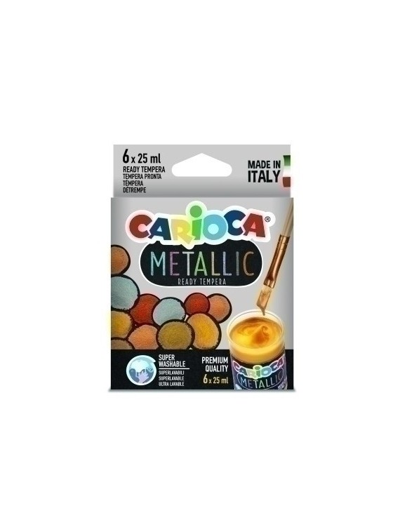 Témpera en colores miscibles superlavables, con alto poder cubriente. Se aplica sobre todos los materiales porosos. 6 vasitos de 25 ml en colores metálicos surtidos.