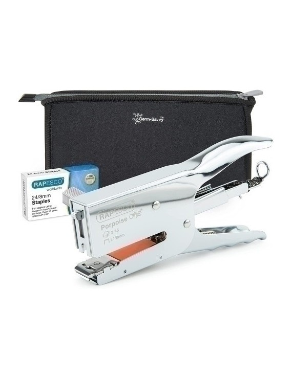 Grapadora de tenaza metálica con sistema de grapado en bypass, y capacidad de 2 a 45 hojas (80 g/m²). Su empuñadura ergonómica y su cómodo mecanismo de carga posterior facilitan su uso. Apta para grapas Rapesco de 24/8 mm. Se suministra en una práctica bolsa de almacenamiento de neopreno con agente especial antibacteriano Germ-Savvy; y con una caja de 1000 grapas Rapesco 24/8 mm.